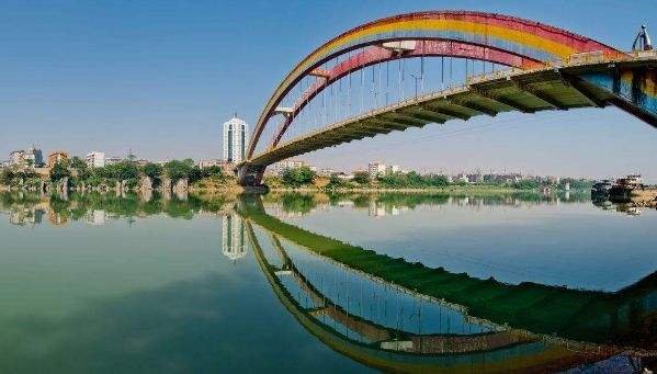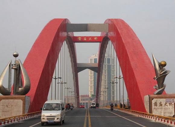 大桥为主跨312米的中承式钢骨拱桥。结构为两条 平行的钢管铪箱型截面拱肋,肋宽3.0~4.0米,肋高5.0~6.8米,矢高52米,矢跨比六分之一。其跨度居当时世界同类桥梁之首。引桥为两组4×16米预应为U型空心板。全桥总长458.4米。桥面行车道12米,人行道2×3.45米,桥面总宽18.9米,纵坡2%。设计荷载:汽车一超20级;桂车—120;人群3.5千牛/平方米。设计洪水频率:P=1%。设计通航水位:H—71.46米。设计通航净高:250×10米。