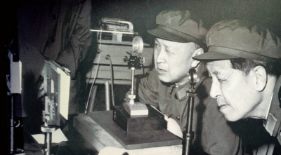中国科学院院士、中国工程院院士钱学森(左)在风洞试验中心视察