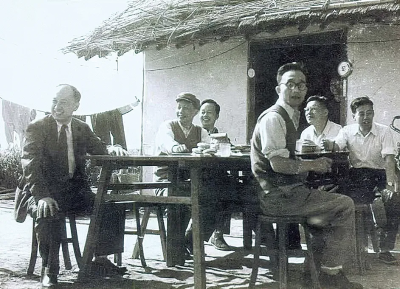 钱学森(左一)与学生们在一起