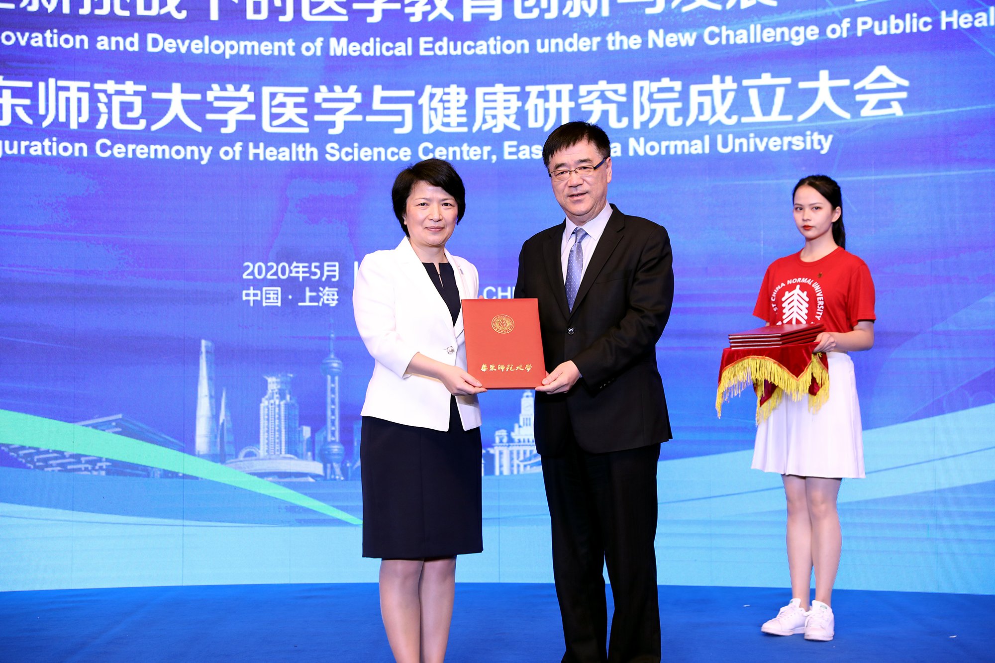 2020年5月23日,中国工程院院士、上海交通大学医学院附属瑞金医院院长宁光(右)受聘华东师范大学医学与健康研究院专家咨询委员会委员