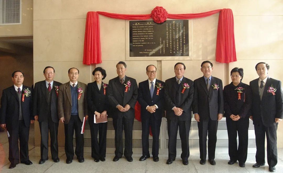 2003年12月,时任北京市委副书记、代市长王岐山(右四),香港著名实业家李嘉诚先生(右五)为北工大科学楼碑文揭幕