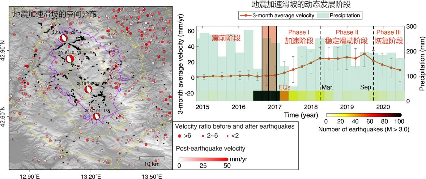 李振洪团队使用2014—2020年共6年的哨兵-1卫星雷达观测数据,采用干涉合成孔径雷达(InSAR)时间序列技术,系统探测2016-2017年意大利中部地震序列所诱发的地震加速滑坡。对探测到的819个地震加速滑坡进行空间和统计分析,发现地震加速滑坡不依赖强烈地面震动或者断层上盘效应触发,即使微弱的地震地面震动也会触发滑坡加速,这一特征与受强地震动控制的同震滑坡显著不同。该团队还发现滑坡大小是地震加速滑坡的重要调节因素,规模较大的滑坡比小滑坡更容易发生震后加速。