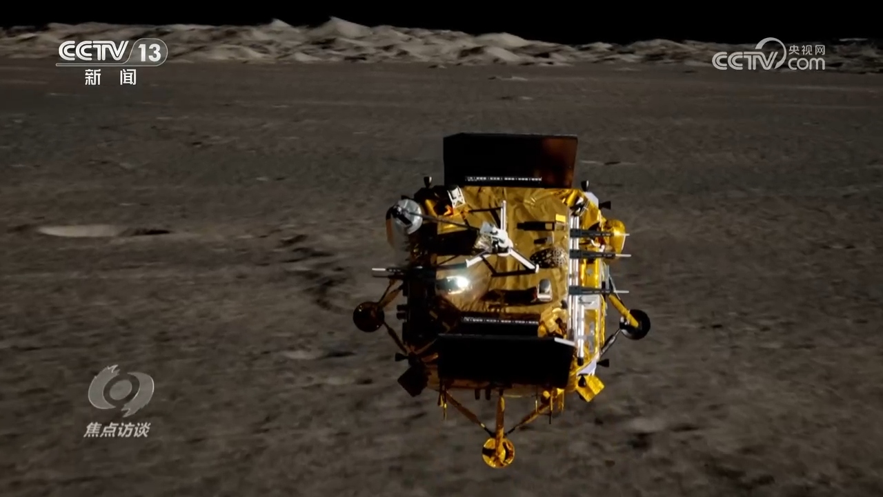 中国航天科技集团邓湘金:“铲子铲土看上去是很容易的事情,但在38万公里的角度去看还是非常困难的。我们采用了新的‘人在回路’的控制方案,就是把一些人的知识和一些智能的学习算法,集成在地面的解算软件里面,当天上钻取的过程中,地面系统就能够根据这些知识快速识别出天上现在是什么样的状况,能让操作员精准地快速地做出正确决策。”