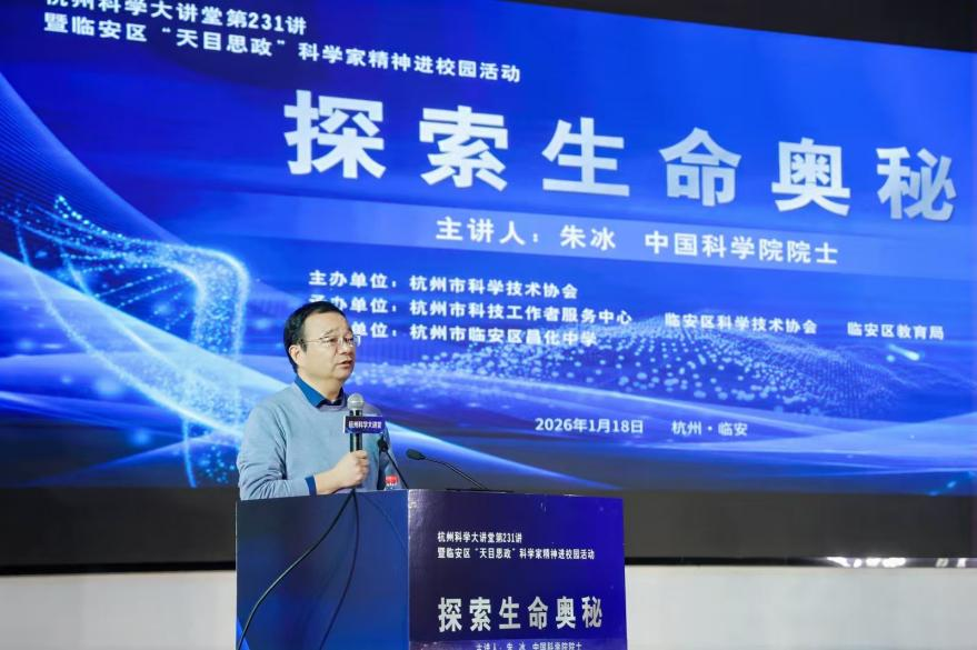 近日,杭州科学大讲堂第231讲暨临安区“天目思政”科学家精神进校园活动在昌化中学举行。昌化中学杰出校友、中国科学院院士、中国科学院生物物理研究所副所长朱冰回到母校,为全体师生带来一场题为《探索生命的奥秘》的专题报告。活动吸引近1500名师生与科研人员聆听,线上直播量更是突破17万人次,反响热烈。