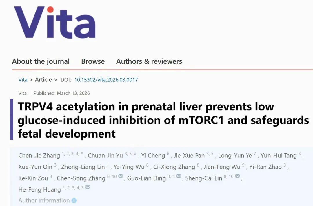 2026年3月13日,浙江大学医学院黄荷凤院士团队联合厦门大学生命科学学院林圣彩院士团队,在《Vita》上在线发表了《TRPV4 acetylation in prenatal liver prevents low glucose-induced inhibition of mTORC1 and safeguards fetal development》研究成果,揭开了这把守护生命初期健康的“分子钥匙”。这也是《Vita》新版官网首篇上线的原创研究论文。
